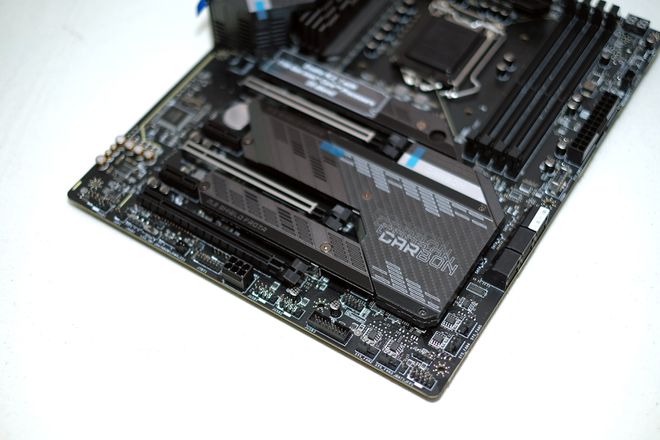 Một tấm tản nhiệt lớn ở góc phải của MSI MPG Z590 Gaming Pro Carbon WiFi có lớp vân sợi các-bon và được khắc chữ Carbon đơn sắc. Bo mạch chủ có 6 cổng SATA III, 1 cổng USB 3.2 Gen 2, 1 cổng USB 3.0 và 2 cổng USB 3.0 cho mặt trước. Không thể thiếu là 4 đầu cắm đèn LED RGB mở rộng, cùng 8 đầu cấp nguồn cho quạt.
