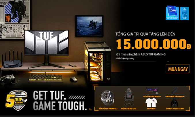 - Mua Bo mach chủ + Card đồ hoa + Thiết bị ngoại vi router tặng Giá đỡ card ROG HERCULX + áo khoác ASUS TUF Gaming phiên bản giới hạn tổng trị giá 2,000,000đ