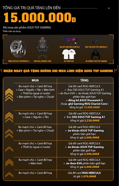 - Mua Bo mạch chủ + Card đồ hoạ + Case + Nguồn + Tản + Màn hình + Thiết bị ngoại vi router + Bàn phím + Tai nghe + Chuột tặng Giá đỡ card ROG HERCULX + Box SSD ASUS TUF Gaming A1 + áo thun EVA + áo khoác ASUS TUF Gaming phiên bản giới hạn + đồng hồ ASUS Vivowatch 5 (hoặc ghế Gaming ROG Chariot Core tổng trị giá 15,000,000đ