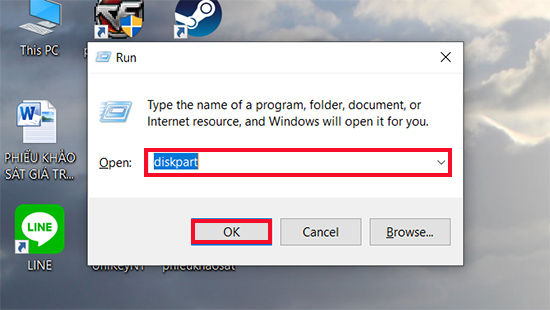 - Bước 1: Nhấn tổ hợp phím Windows + R để mở hộp thoại Run sau đó nhập diskpart và chọn OK để truy cập.