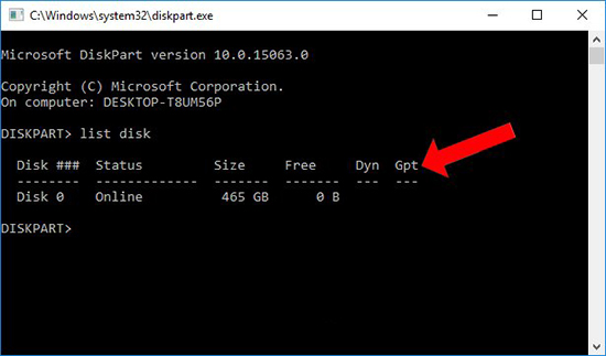 - Bước 3: Chú ý đến cột Gpt, nếu dòng tên ổ cứng nào ở cột GPT có dấu * thì ổ cứng đó theo chuẩn GPT.
