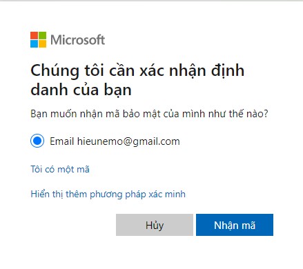 Bước 3:  Xác nhận danh tính, và chọn nhận mã bảo mật qua Email