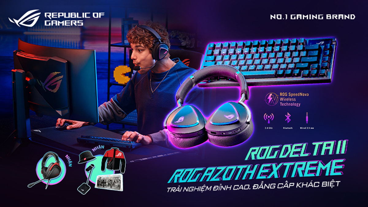 - Mua tai nghe Gaming không dây ROG Delta II nhận ngay bộ quà tặng bao gồm đến treo tai nghe ASUS Metal Stand, nón bucket ROG, bộ lego lắp ráp ROG, áo khoác ROG phiên bản giới hạn