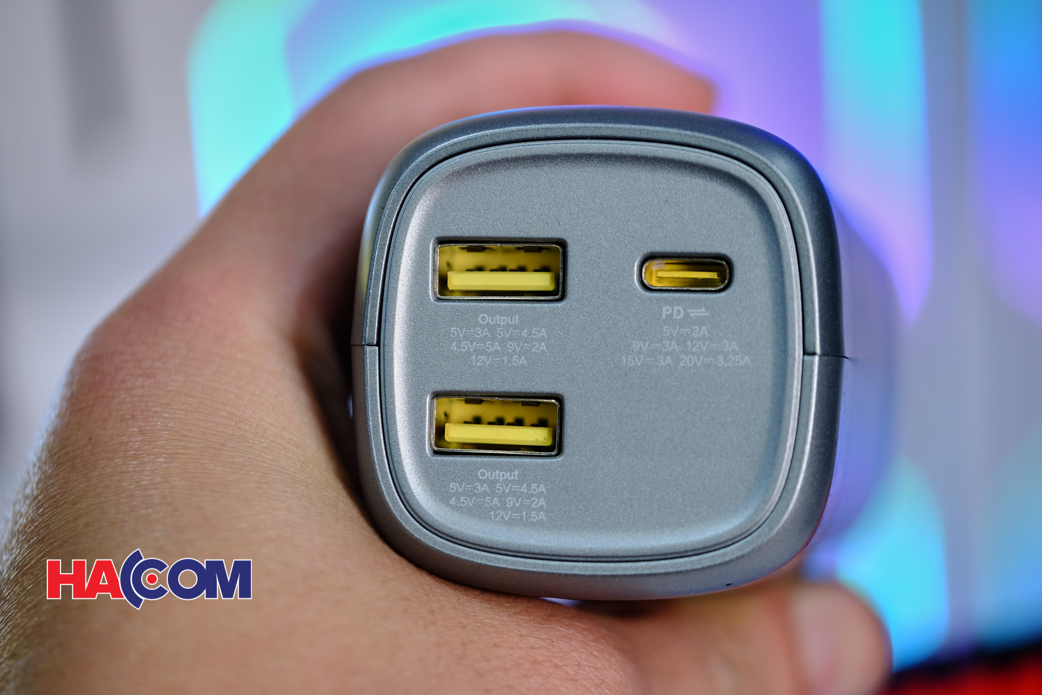 Công nghệ sạc nhanh 2 chiều qua cổng USB-C có tích hợp PD, ngoài ra còn có 2 cổng USB-A khác để các bạn có thể sạc 3 thiết bị cùng lúc. Cấu hình các cổng sạc được in rất rõ nét ngay bên dưới.