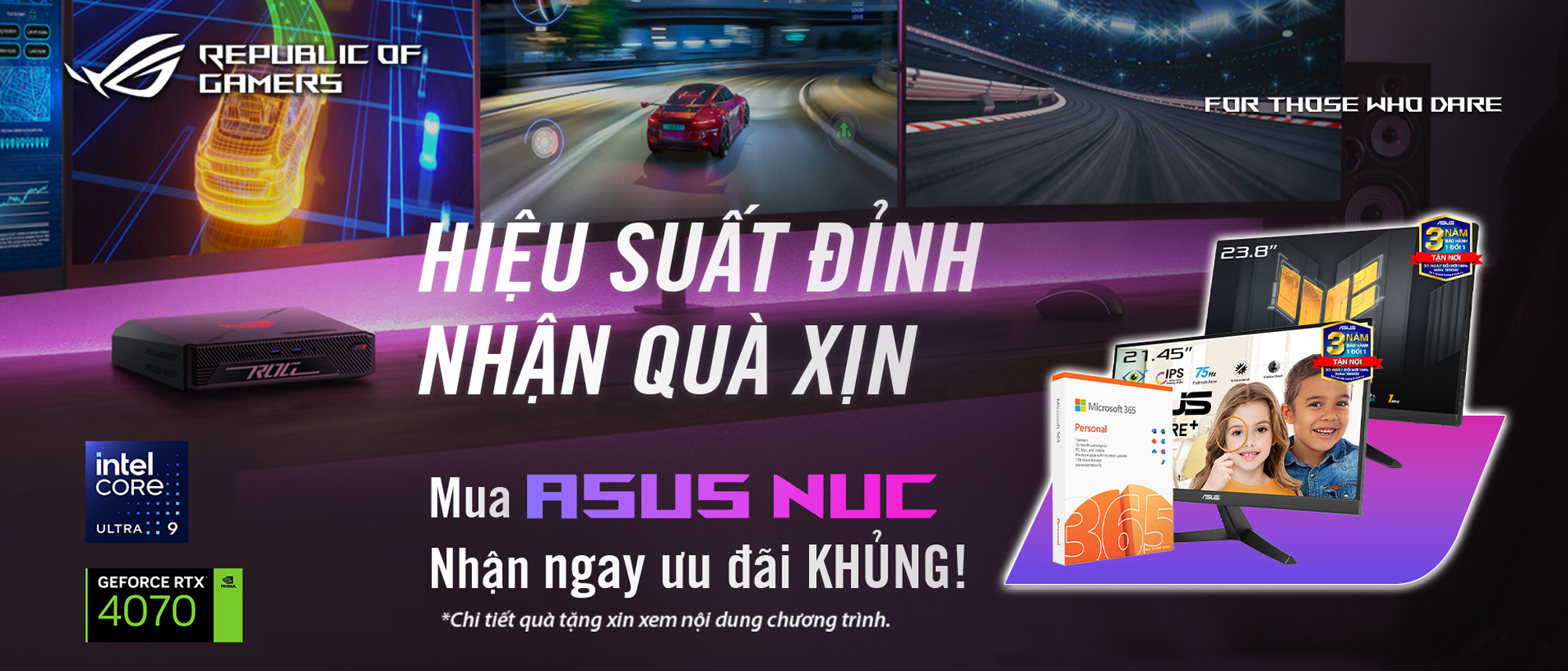 - Combo 3: Khách hàng mua màn hình gaming ASUS ROG kèm ASUS NUC được tặng Office 365 từ hãng.