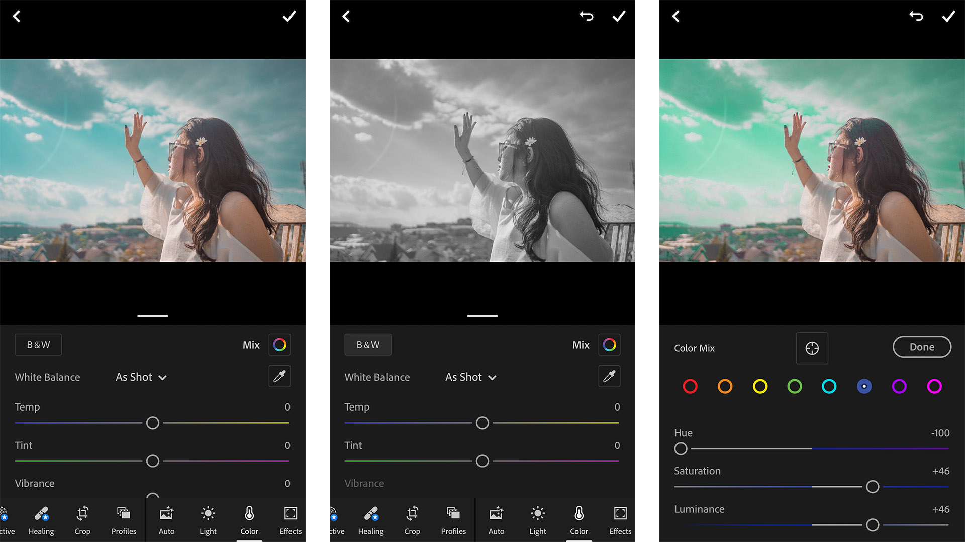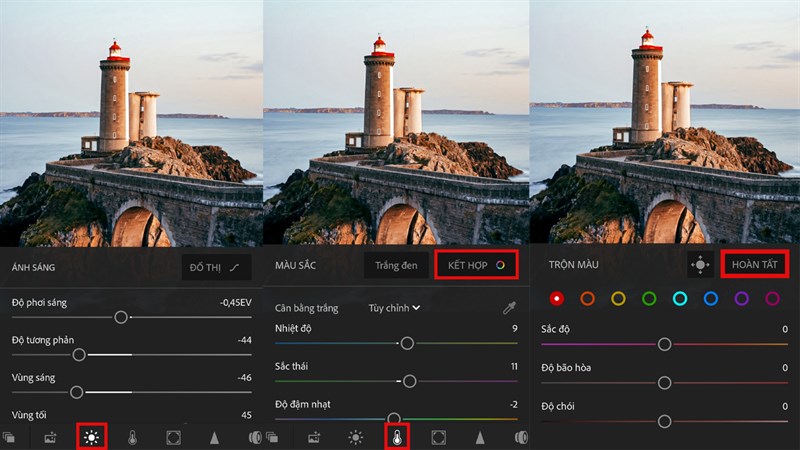 Đến với ứng dụng Adobe Lightroom Photo Editor, bạn sẽ có bộ công cụ chỉnh màu mạnh mẽ. Bạn dễ dàng chỉnh ảnh với nước màu ấm hơn, màu ám xanh, ám hồng, màu ảnh rực rỡ hơn… Đặc biệt, ứng dụng hỗ trợ bạn chỉnh sửa từng màu của bức ảnh theo ý muốn.