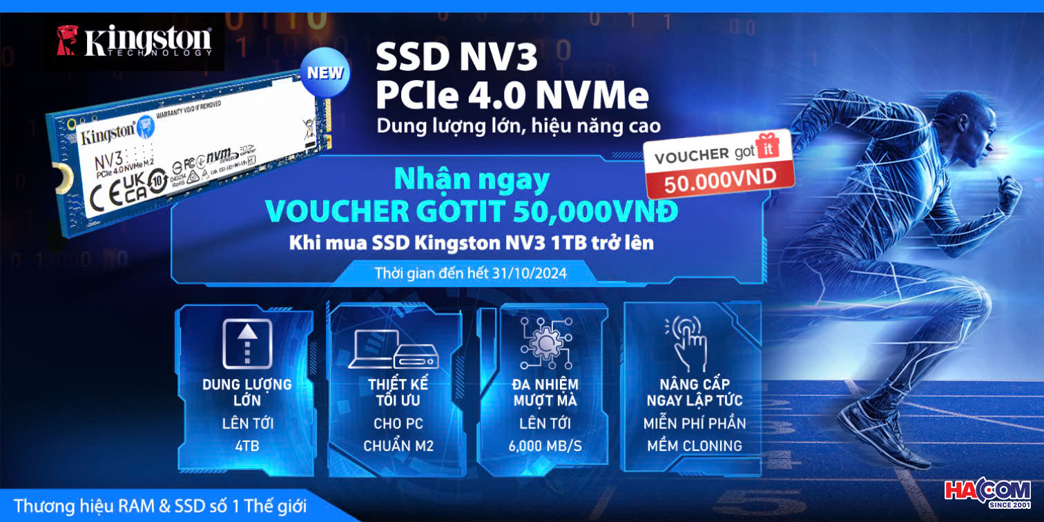 - Nhân dịp ra mắt sản phẩm Ổ cứng SSD Kingston NVMe NV3 PCIe 4.0, khi mua SSD NV3 dung lượng 1TB trở lên, nhận ngay thẻ quà tặng Got it 50k.