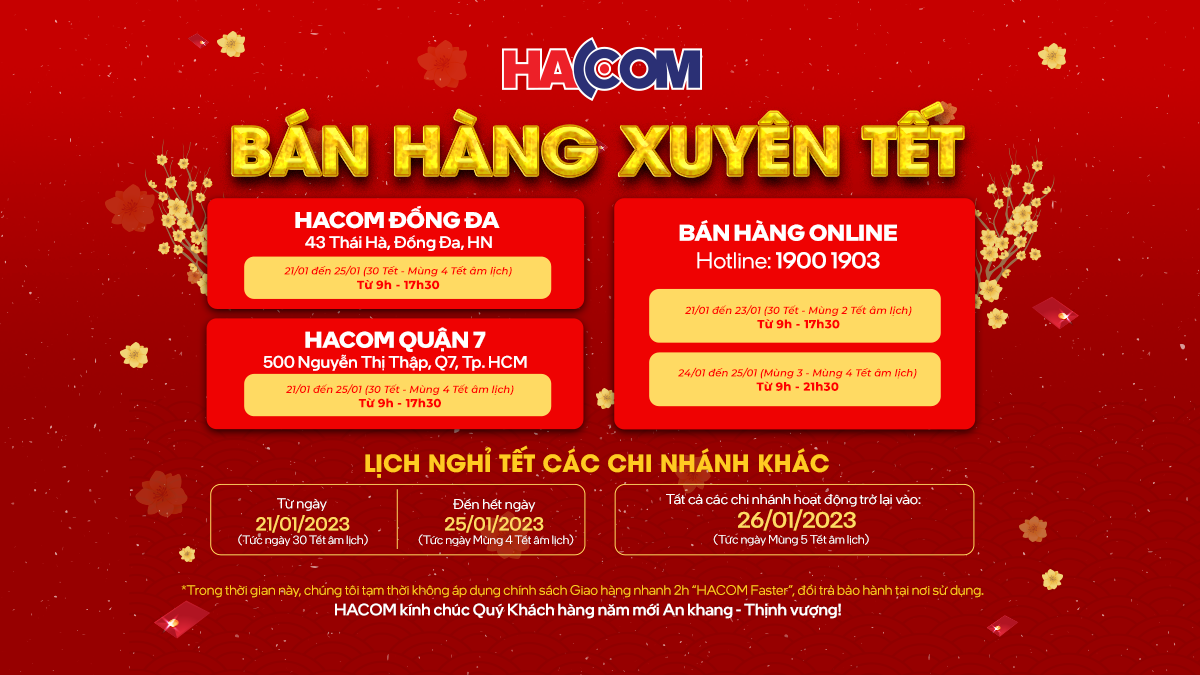 Trong thời gian này, chúng tôi tạm thời không áp dụng chính sách Giao hàng nhanh 2h “HACOM Faster”, đổi trả bảo hành tại nơi sử dụng. Sau ngày 25/01/2023 mọi chính sách hoạt động trên trở lại bình thường. Mong Quý khách hàng thông cảm!