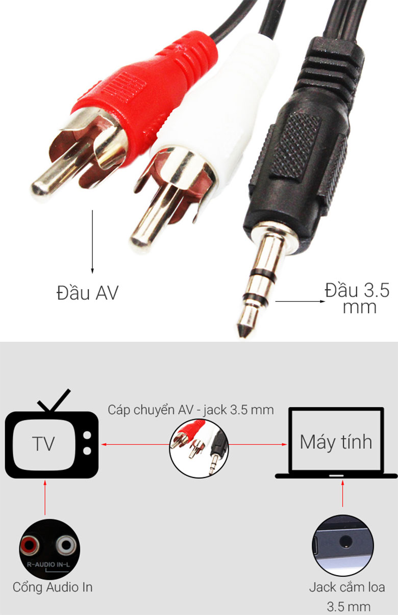Đầu AV cắm vào cổng Audio In trên tivi cùng màu trắng đỏ, đầu 3.5 mm bạn cắm vào jack tai nghe trên laptop.