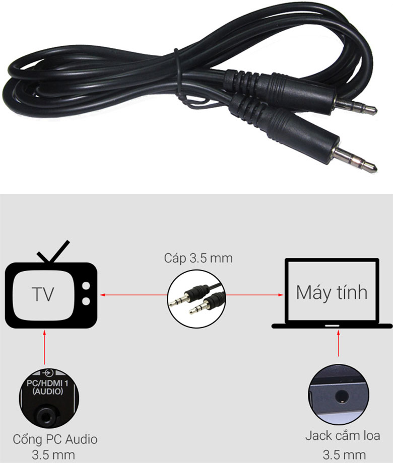 Một đầu cáp cắm vào cổng PC Audio In trên tivi, một đầu cắm vào jack tai nghe trên laptop.