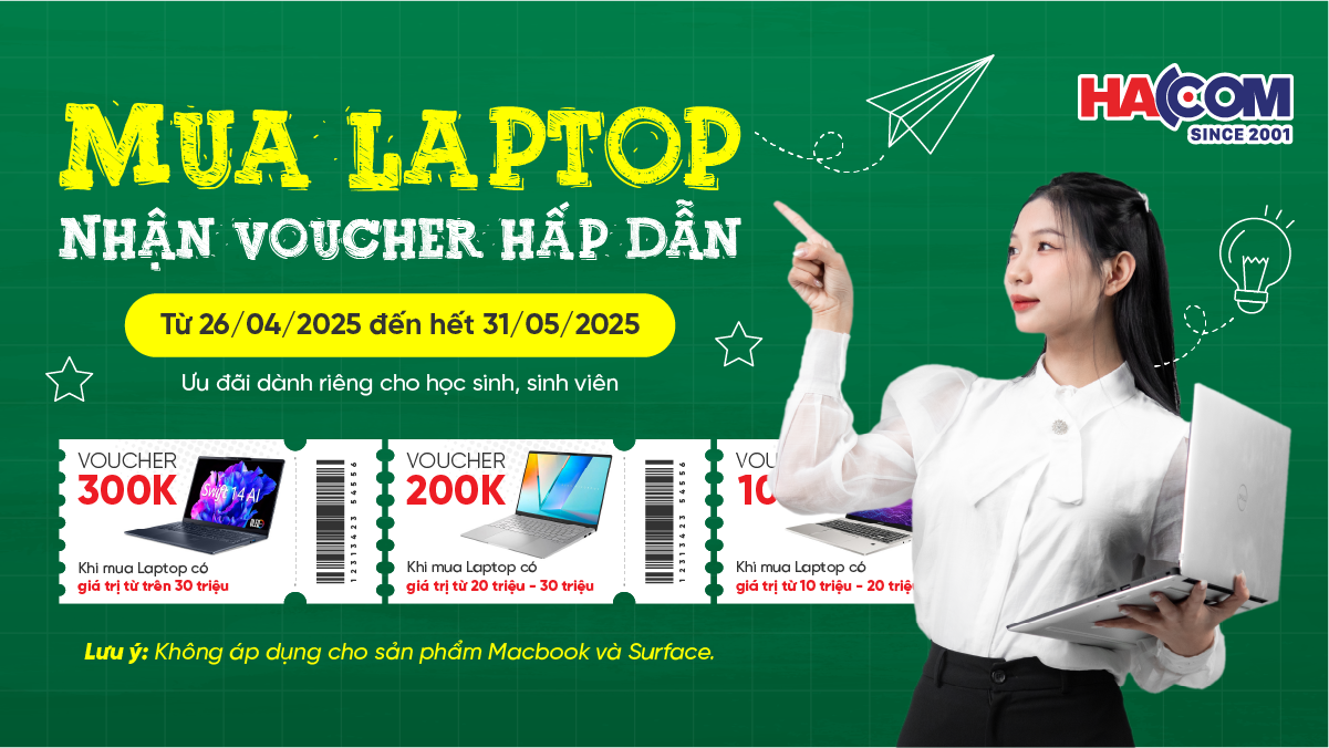 Từ ngày 26/04/2025 đến hết ngày 31/05/2025, HACOM triển khai chương trình "ƯU ĐÃI HỌC SINH - SINH VIÊN mua LAPTOP" với những mức giảm giá cực kỳ hấp dẫn: