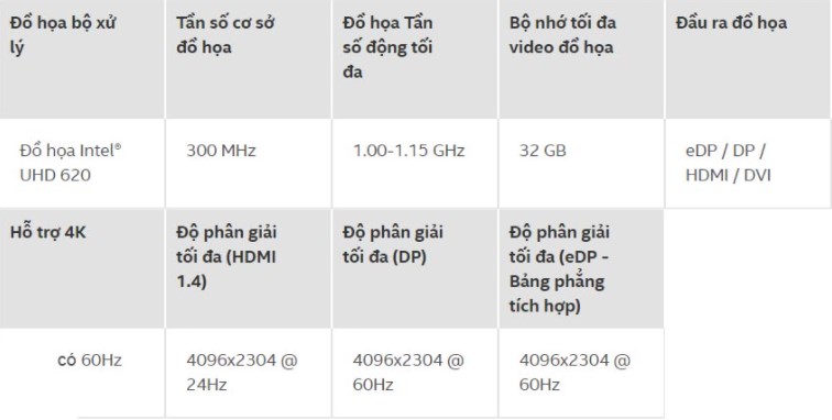 Intel UHD Graphics 620  được xây dựng công nghệ chip 14nm. Cùng bộ xử lý đồ họa Skylake GT2 cho khả năng xử lý đồ họa mượt mà và ổn định. Nó cấu thành bởi 192 đơn vị bóng, 24 đơn vị bản đồ kết cấu và 3 ROP. GPU hoạt động tại tần số 300Hz khả năng đáp ứng lên đến 1050 MHz.