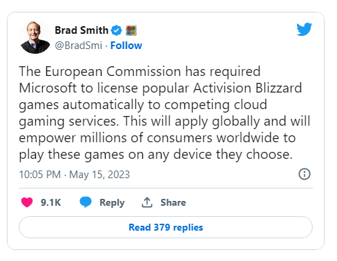 Thỏa thuận trị giá 68,7 tỷ đô la của Microsoft để mua lại Activision Blizzard đã được các cơ quan quản lý của EU phê duyệt chỉ vài tuần sau khi các cơ quan quản lý của Vương quốc Anh ngăn chặn sự việc này. Ủy ban Châu Âu đã kết luận rằng thỏa thuận có thể được thông qua nhờ các cam kết từ Microsoft liên quan đến nền tảng chơi game đám mây.