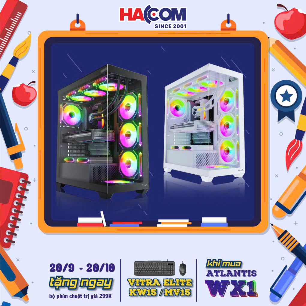 - Khi mua sản phẩm vỏ máy tính VITRA ATLANTIS WX1 khách hàng sẽ được tặng ngay 1 combo phím chuột Vitra Elite KW15/MV15 (KBKM002/MEKM017) trị giá 499.000.