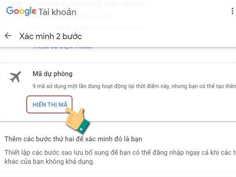 Trong đây, bạn sẽ thấy mục "Mã dự phòng". Nhấp vào nút "Hiển thị mã" để kiểm tra các mã dự phòng hiện có hoặc để tạo một bộ mã mới nếu cần thiết.