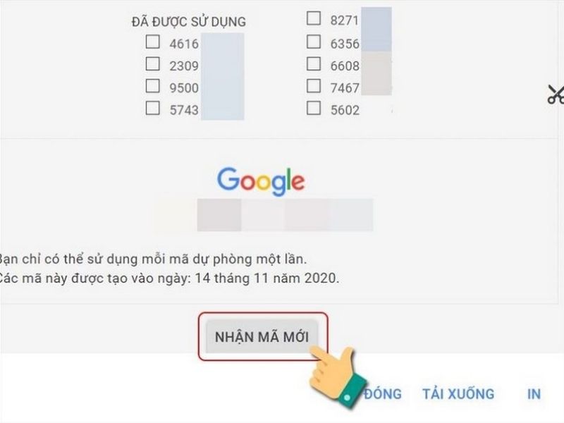 Bước 2: Trong trường hợp bạn đã làm mất các mã dự phòng trước đó hoặc muốn thay thế chúng, hãy tìm và lựa chọn tùy chọn "Nhận mã mới". Thao tác này sẽ cho phép hệ thống tạo ra một tập hợp các mã dự phòng hoàn toàn mới, thay thế cho những mã đã mất hoặc mà bạn cảm thấy không còn an toàn.
