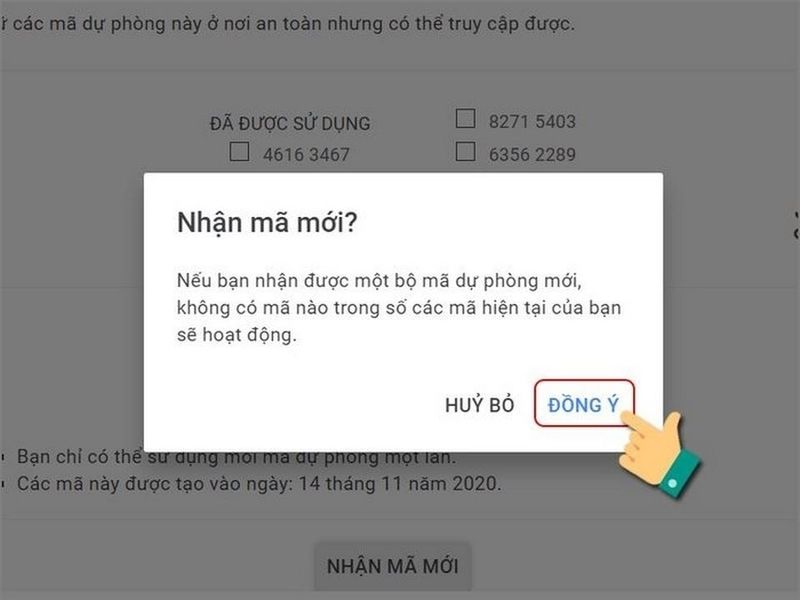 Tiếp theo đó sẽ một thông báo sẽ hiển thị để bạn xác nhận sự đồng ý với thao tác này. Hãy nhấn vào nút "Đồng ý" để hoàn tất quá trình tạo mã dự phòng mới. Cần lưu ý rằng tất cả các mã dự phòng cũ sẽ không còn hiệu lực sử dụng sau khi bạn tạo bộ mã mới. Vì vậy, hãy đảm bảo lưu trữ an toàn bộ mã dự phòng vừa tạo để có thể truy cập vào tài khoản của mình trong các lần tới.
