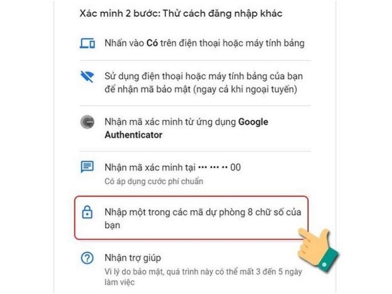 Trong danh sách các tùy chọn, chọn "Nhập một trong các mã dự phòng 8 chữ số của bạn".