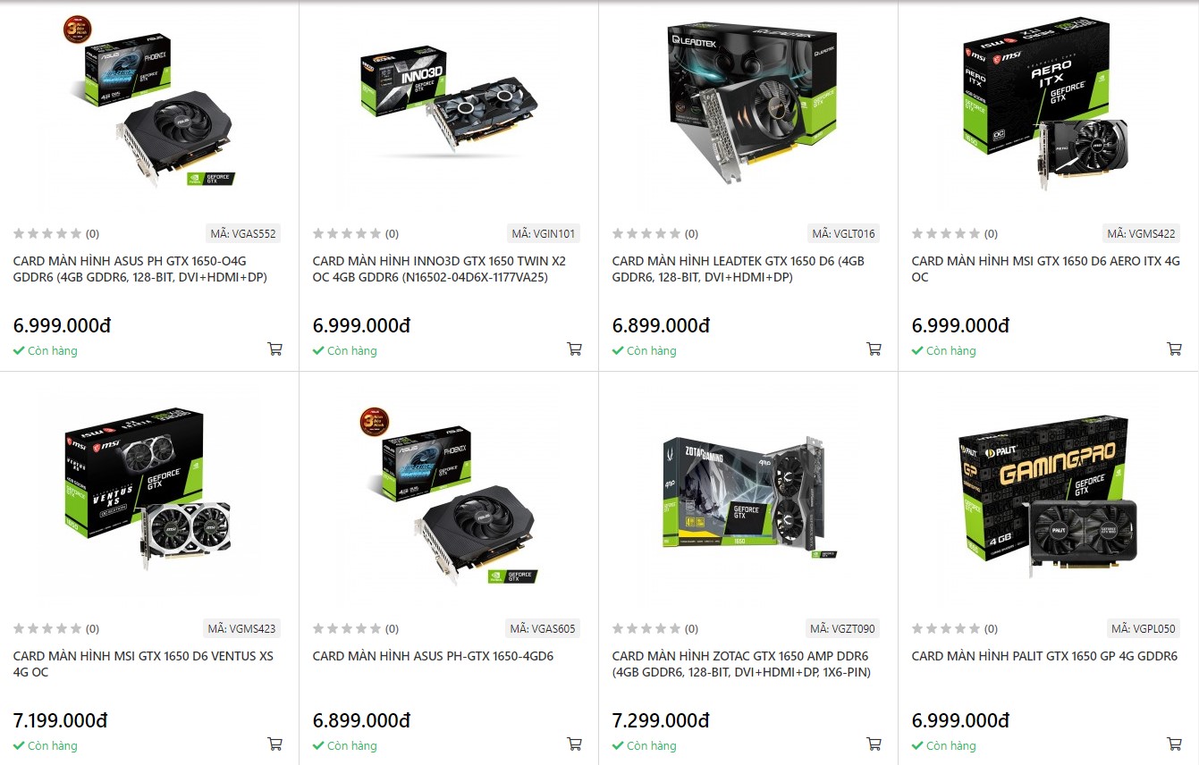 Trong khoảng giá từ 6,5-7 triệu đồng, người dùng chỉ có thể mua được mẫu card đồ họa được Nvidia ra mắt vào năm 2019 là GTX 1650. Mức giá hiện tại của GTX 1650 cao hơn đáng kể so với thời điểm cách đây 1-2 năm, vốn dao động trong khoảng 4,5 -5,2 triệu đồng tuỳ phiên bản.