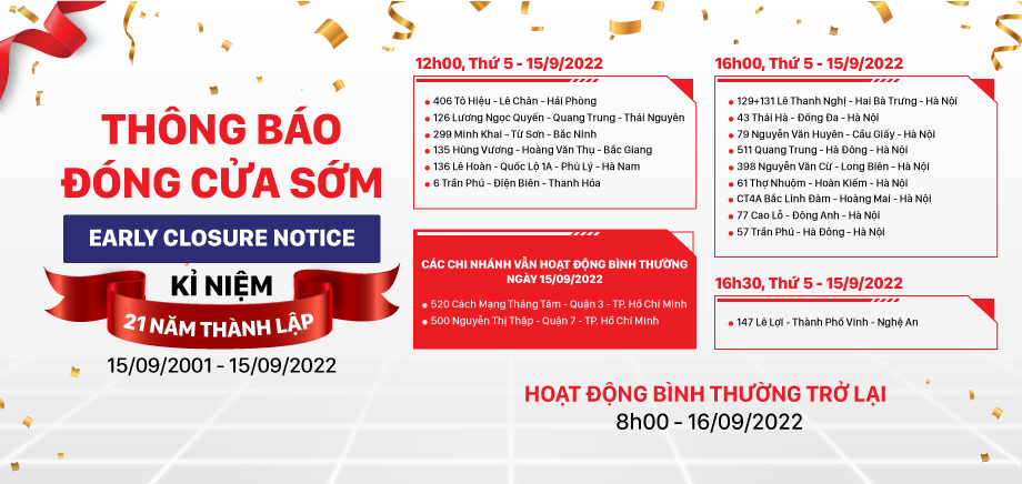 - Các chi nhánh sẽ đóng cửa tạm thời từ 12:00 trưa, Thứ 5, ngày 15/09/2022: