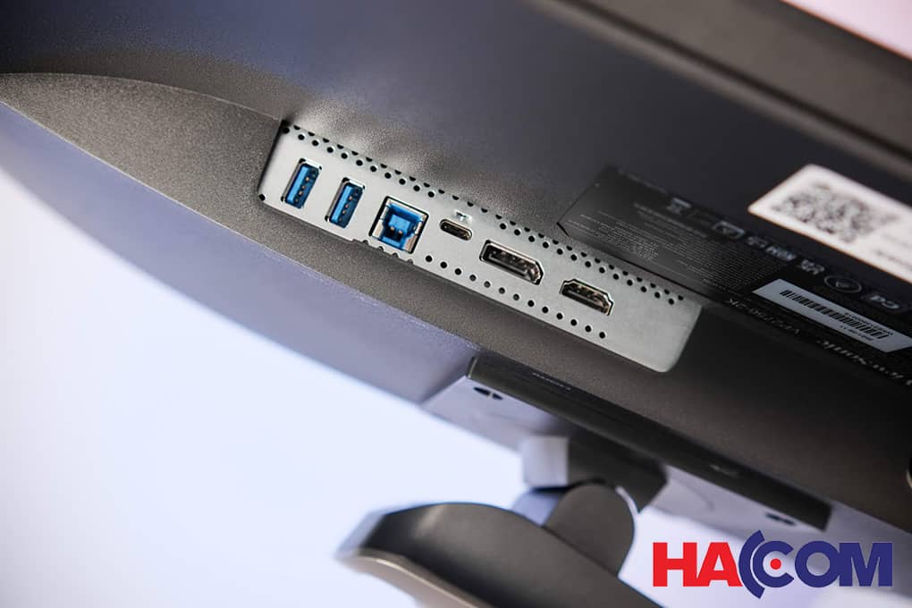 Sở hữu loạt cổng kết nối tiên tiến giúp màn hình có thể xuất hình từ hầu hết các thiết bị: máy tính bản, smartphone, PC, laptop. Bao gồm: hai cổng HDMI 2.0, một DisplayPort 1.4, hai USB Type-A, một USB Type-B. Chưa kể đến một cổng USB Type-C hỗ trợ chức năng Power Delivery lên tới 60W. Nghĩa là người dùng có thể kết nối với macbook nói riêng, laptop nói chung vừa có thể mở rộng không gian hiển thị với màn hình, và tích hợp sạc. Cuối cùng là dải loa 2x 2W được tích hợp để làm nhiệm vụ chống cháy, trong vài tình huống nhất định.