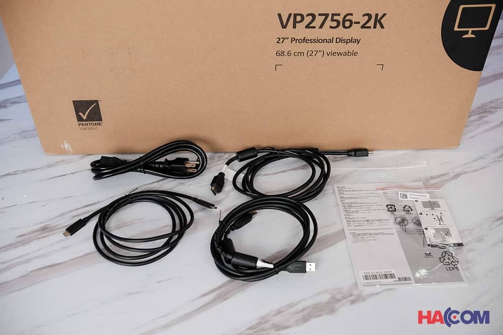 Sản phẩm ẩn sau bên trong một chiếc hộp làm từ bìa carton thông, có chút đơn giản. Nhìn bê ngoài tưởng chừng chỉ là một chiếc màn hình văn phòng thông thường, nhưng bạn sẽ khá giật mình bởi thông số kĩ thuật của nó. Đập vào mắt người dùng sau khi bỏ toàn bộ ra ngoài là một chiếc màn hình kích cỡ 27 inch, chân đế được cách điệu theo dáng mềm mại, mặt đế và các sợi dây kết nối tín hiệu. Ngoài cáp nguồn, hướng dẫn sử dụng thì hãng để sẵn cáp HDMI 2.0, Type-C, USB 3.2.