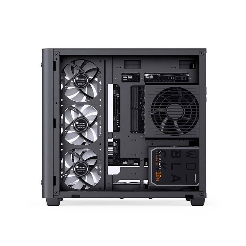 Mặt dưới hỗ trợ lắp 2 quạt để bạn có thể hút gió mát từ phía dưới đẩy lên trên giúp tản nhiệt cho card màn hình. Case Jonsbo hỗ trợ với hầu hết các loại card màn hình 2 quạt.
