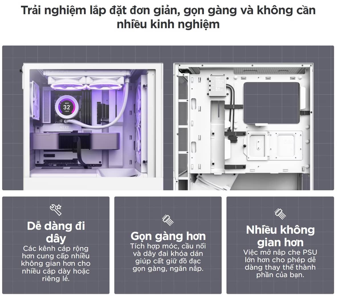 Dù mang kiểu dáng Mid-Tower gọn gàng nhưng bên trong vỏ máy tính NZXT H5 Flow Black lại là một không gian cực kỳ rộng rãi và khoa học. Case hỗ trợ đa dạng các loại bo mạch chủ từ Mini-ITX đến cả những dòng E-ATX cao cấp. Người dùng có thể thoải mái lựa chọn các dòng tản nhiệt khí tháp đôi cao tới 165mm hoặc lắp đặt tản nhiệt nước Radiator 280mm ở mặt trước và 240mm trên nóc một cách dễ dàng. Sự phân bổ thông minh giúp việc lắp đặt các linh kiện kích thước lớn như card đồ họa dòng RTX 40-series trở nên đơn giản hơn bao giờ hết, không lo cấn cá hay chật chội.