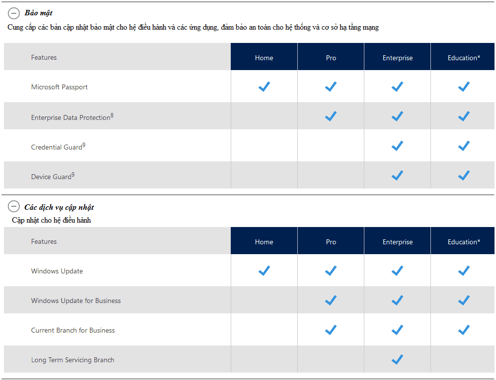 Tóm tắt một số tính năng của các phiên bản Window 10