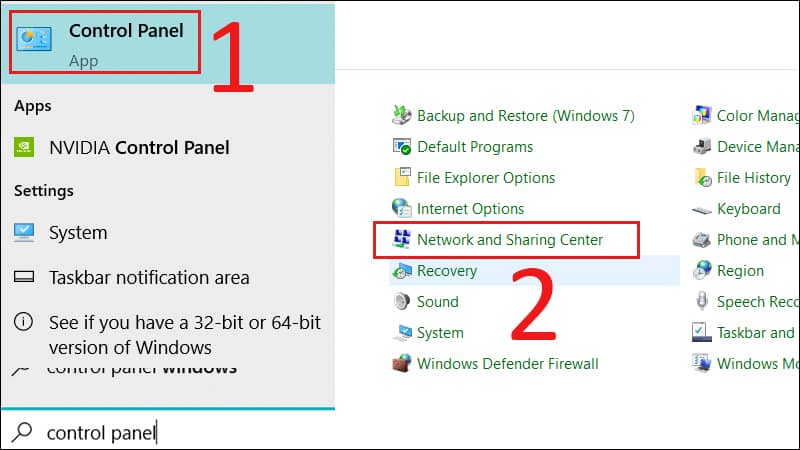 - Bạn click mở Control Panel từ menu Start và click vào Network and Internet và bấm vào “Network and Sharing center” .