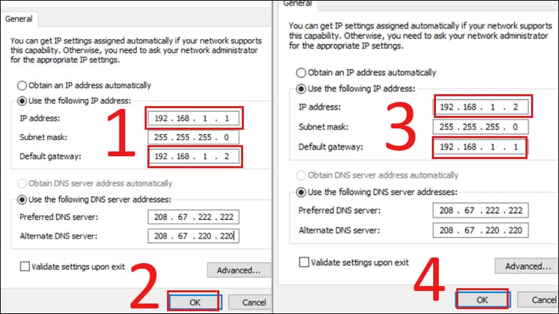 Đầu tiên bạn sẽ gán địa chỉ IP với cả hai máy tính. Để thay đổi địa chỉ IP của máy tính của bạn để kết nối mạng LAN. Bạn nên thay đổi trong phần cài đặt bộ chuyển đổi mạng LAN.